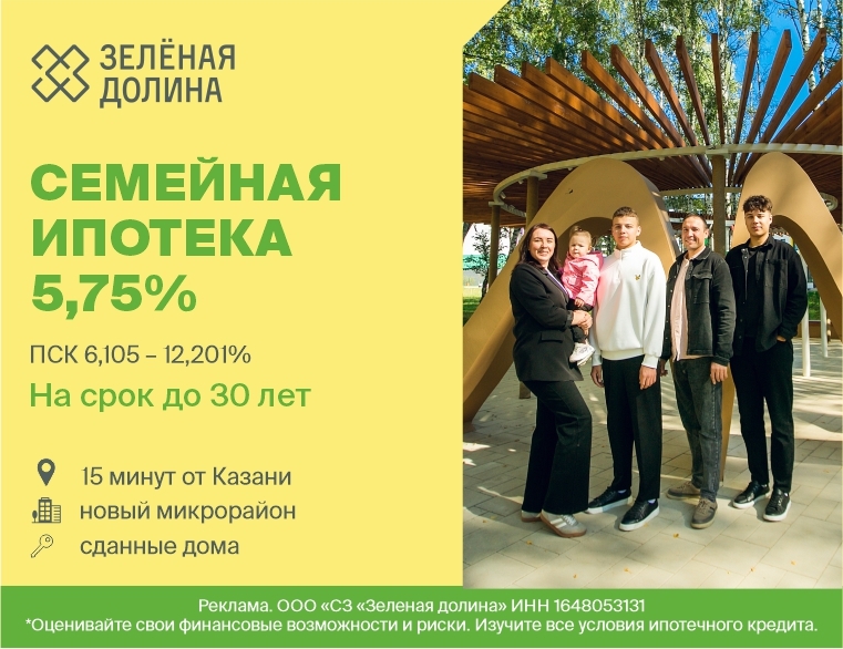 ** Ипотечное кредитование физ.лиц на первичном рынке недвижимости, с гос.поддержкой, для семей с детьми («Семейная ипотека») на приобретение готового и строящегося жилого помещения (квартиры), у Застройщика ООО «СЗ Зеленая долина», ОГРН 1201600088579, ИНН 1648053131, по договорам ДКП и ДДУ.